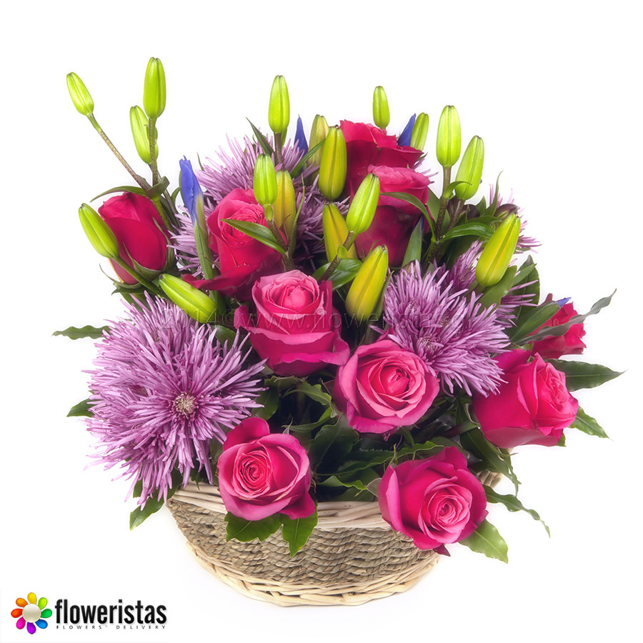 Καλάθι με φούξια τριαντάφυλλα, μωβ χρυσάνθεμα, λίλιουμ και πρασινάδες. (ΤΟ ΣΥΓΚΕΚΡΙΜΕΝΟ ΠΡΟΪΟΝ ΕΙΝΑΙ ΔΙΑΘΕΣΙΜΟ ΜΟΝΟ ΓΙΑ ΠΑΡΑΓΓΕΛΙΕΣ ΜΕ ΠΡΟΟΡΙΣΜΟ ΑΠΟΣΤΟΛΗΣ ΕΝΤΟΣ ΛΕΚΑΝΟΠΕΔΙΟΥ ΑΤΤΙΚΗΣ)
